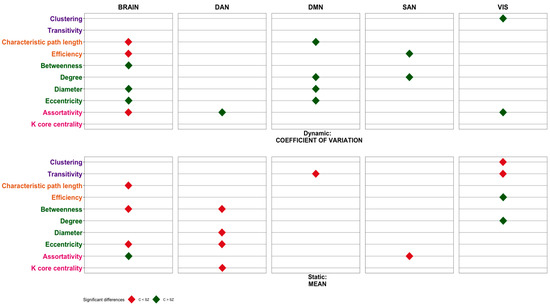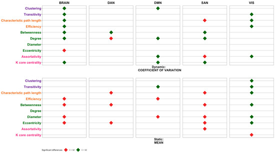 Figure 3 presents the significant differences found in each of the graph metrics to characterize functional connectivity between individuals diagnosed with schizophrenia and the group of healthy controls for each of the networks (DAN, DMN, SAN, VIS, and Brain). The top row of Figure 3 shows the differences found in the functional connectivity metrics using the dynamic information of time series (coefficient of variation) and in the bottom row using the static information (mean). In order to facilitate the understanding of the results in Figure 3, it has been represented with diamonds if differences between the groups appeared, regardless of whether the differences were found in one or several thresholds. Nevertheless, all the information regarding thresholds is presented in Table S2 (Supplementary Material). To facilitate the integration and interpretation of our results, the graph metrics have been grouped according to whether they indicate segregation, integration, centrality, or resilience. In the following figures, a color code has been assigned to each of these categories: segregation metrics (clustering and transitivity) have been coded in purple, integration metrics (characteristic path length and efficiency) have been coded in orange, centrality metrics (betweenness, degree, diameter, and eccentricity) have been coded in green, and resilience metrics (assortativity and k-core centrality) have been coded in pink. The tables presented are an attempt to summarize all the information obtained. All the details of the analyses carried out and additional figures can be found in [52].