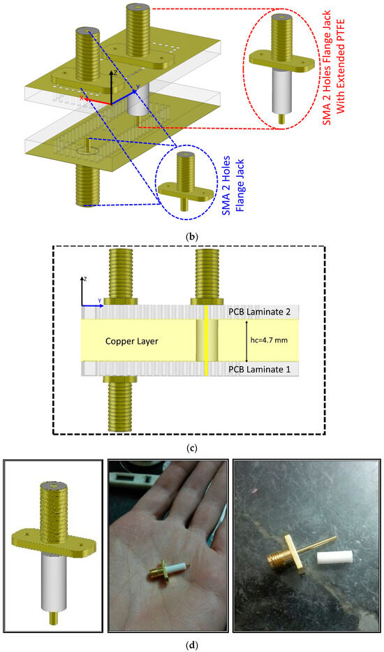 The end pin of the SMA connectors 1 and 2 are soldered in the center of the SIW channel axis. Connector 3 has an extended dielectric, as shown in Figure 1d. The extended dielectric SMA port is the prepared interface that seamlessly penetrates the central copper layer without interference. The material of this dielectric is PTFE (εr = 2.1 and tanδ = 0.0002). The PTFE dielectric is 4.5 mm long. It can be easily removed from the connector metallic pin for structure assembly. The cylindrical dielectric has an inside diameter of 4.1 mm, and an outside diameter of 1.27 mm. Figure 1d illustrates the extended dielectric and its connector together.