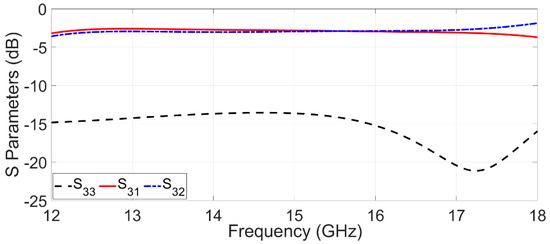 The simulated S-parameters of the proposed diplexing-power divider are presented in Figure 7, originating from the simulation software. They show that the amplitude of the transmission coefficients from port 1 to port 3 or 4 surpasses the −4.5 dB threshold (Figure 7a). The same result is obtained when observing the transition from port 2 to ports 3 and 4 (Figure 7b). Given the inherent necessity to distribute power across two distinct ports, we can conclude that the achieved insertion loss was less than 1.5 dB. The impedance bandwidths for amplitudes of S11 and S22 less than −10 dB is 10.2% (13 GHz to 14.4 GHz) and 9.2% (16.6 GHz to 18.1 GHz), respectively.