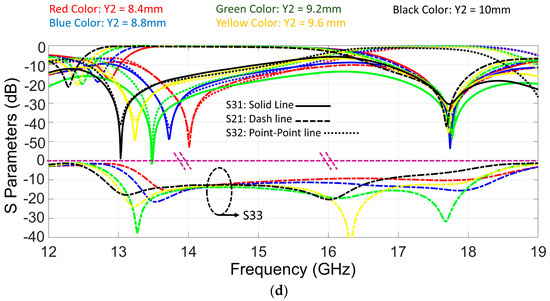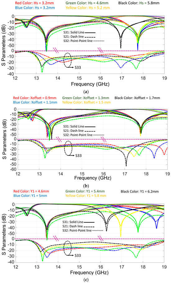 By moving the transition toward the SIW walls, a distinct separation of electromagnetic signals emerges, channeling them into channels 1 and 2 at varying frequency bands. For optimization, the parameters Hs, Xoffset, Y1, and Y2 are changed. These four parameters have the most effect on scattering parameters. By working on these parameters, shifts occur in the values of inductance, capacitive reactance, and conductance within the impedance characteristics of the system. To determine the optimal values for these key parameters, comprehensive full-wave simulations employing CST software were executed. An evaluative exploration is undertaken through a parametrical analysis, depicted in Figure 3, showing the impact of these parameters. Notably, only a singular parameter is altered in each analysis iteration, maintaining constancy across all other parameters. Between these parameters, it seems that Hs, Y1, and Y2 cause S33, S31, and S32, respectively, to shift.