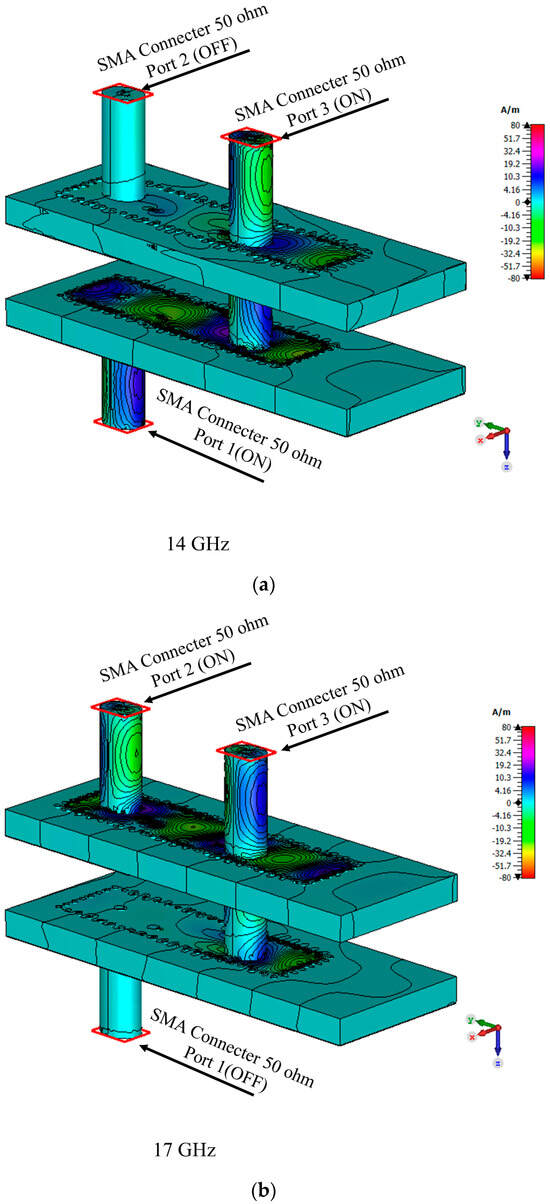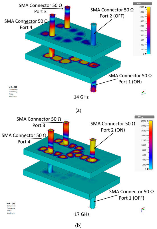 Figure 4 illustrates the distribution of the electric fields on the SIW channels at 14 GHz (low-frequency band) and 17 GHz (high-frequency band) of the diplexing network. In this case, the mechanism’s topology can be comprehended. If port 1 is excited in the low-frequency band, the RF signal first propagates in SIW channel 1. After that, the propagated signal is vertically transitioned by the proposed transition. Once the signal is propagated into the vertical transition, port 3 becomes active. In this configuration, no RF signal propagates into SIW channel 2. Channels 1 and 2 are thus isolated from one another. If port 2 is excited in the high-frequency band, the RF signal is transmitted in SIW channel 2, and it enters the proposed vertical transition at the end of channel 2. After that, it reaches the vertical transition, and port 3 becomes active. In this configuration, no RF signals pass through SIW channel 1. Channel 1 and channel 2 are, therefore, again isolated.