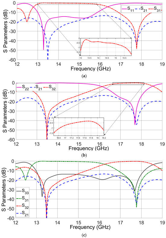 Simulated scattering parameters for the proposed diplexing structure. (a) Port 1 is excited. (b) Port 2 is excited. (c) Port 3 is excited.