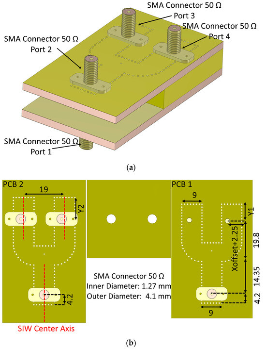The geometry of the proposed SIW diplexing network is depicted in Figure 1, encompassing all aspects of design, layers, and the advanced SMA port. It is composed of two stacked SIW channels from top to bottom, including two Ro 4003c PCB laminates (εr = 3.55 and tanδ = 0.0027). Both PCB laminates have the same height of 1.6 mm.