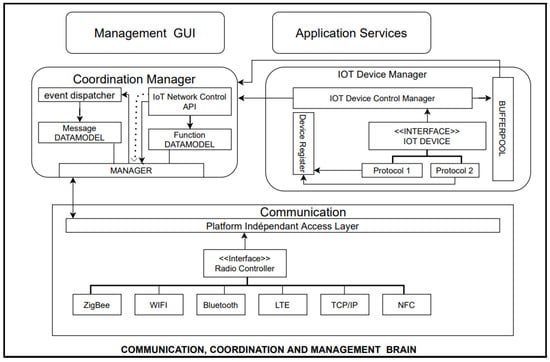 The communication module is responsible for the reception and transmission of messages in the air. This also directs the broadcasting duty cycle. The second IoT device management block module is the interface. The third coordination manager block module manages the interaction of the other two modules. The coordination manager block has four blocks: event dispatcher (triggers event occurrence), function data model (represents the functionality of an IoT device), message data model (forwards message after an activity or an event), and IoT network control (interface for developers).