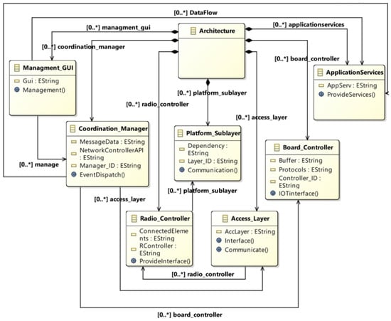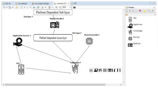 In Figure 4, the developed Sirius tool is shown using the Obeo designer 11.8 to validate the Metamodel we proposed earlier in this paper. In Figure 4, we can see that all components are attached to the sublayer. The access layer must be connected to the Radio Controller. The GUI aids in viewing the settings and controlling the system’s actions through a smartphone. The Pallet in the corner shows components like the GUI, App Service, comanager, BoCont, and RadCont.