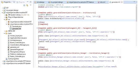 Acceleo facilitates transforming models into textual content that can be source code in various programming languages, reports, documentation, or any other form of structured text. Figure 5 shows the generated model-to-text transformations (MTL) to generate text artifacts from unified modeling language (UML) models using a model-driven development approach. Acceleo was used for this task and was employed in this study.