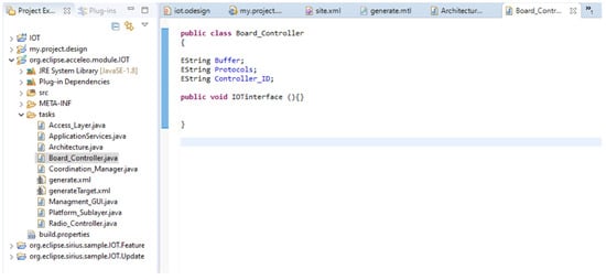 Software systems, particularly IoT systems, cannot survive in isolation. For proper and efficient functioning, they must be interconnected. In IoT, devices cannot communicate with other devices with different specifications without having the same standards and protocols. In this metamodel, classes are integrated so that the devices and sensors can interact despite having different technical specifications. The architecture of this metamodel consists of a management_GUI, a coordination manager, a radio_controller, a platform_sublayer, an access_layer, a board_controller, and application services. The model has too many (0…*) cardinalities among the classes. The proposed meta-model is illustrated in Figure 3. It comprises several modules including management GUI, application services, coordination manager, radio controller, platform layer, access layer, etc. Each module is designed to carry out specific tasks, and these modules work in close coordination. For practical feasibility, the system is implemented using the SIRIUS and Acceleo tools, and implementation details are described in subsequent sections.