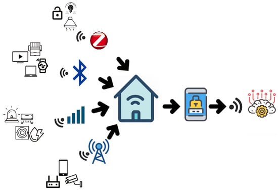 This study considers a communication scenario in IoT that contains devices and sensors with heterogeneous communication services to evaluate the proposed solution. Consider a smart home environment with TVs, watches, air conditioners, environmental IoT devices, and other sensors. Some devices, such as TVs, air conditioners, and surveillance cameras, use Wi-Fi as a standard for communication. Other smart devices may use Bluetooth, ZigBee, long-term evolution (LTE), or other off-the-shelf standards or protocols for communication. Figure 7 illustrates the communication scenario of the case study considered in this study.