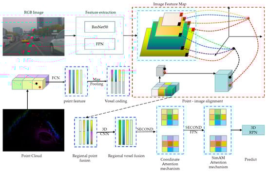 The framework of 3D object detection based on multimodal fusion. After the image and point cloud data pass through their respective feature extraction networks, the image and point cloud features are obtained, respectively. Then, the point cloud and image features are matched, and the multimodal information fusion operation is achieved by regional point fusion and voxel fusion. Finally, 3D target prediction output is produced using the Coordinate and SimAM attention mechanisms.
