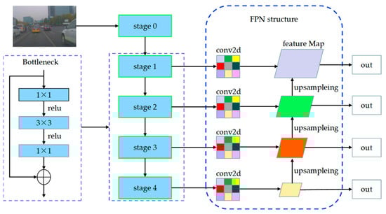 In image processing, the performance of convolutional neural networks improves with increasing depth to extract more advanced features. However, traditional convolutional neural networks will encounter problems, such as network decay, gradient explosion, and gradient disappearing with increasing depth, resulting in a decline in network performance with increasing depth. To overcome these problems, this paper adopted ResNet50 [47], which employs a residual module as the backbone network for image extraction (shown in Figure 2). The residual module’s introduction solves the network recession issue, while adding a BN layer addresses gradient disappearance and explosion. ResNet50 consists of five stages, namely Stage 0 to Stage 5. The initial stage performs more straightforward tasks, primarily preprocessing the input data. The subsequent four stages (stage 1 to stage 4) comprise bottleneck structures that extract high-level semantic features from the image.