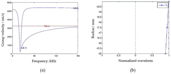 In a cylindrical structure, ultrasonic guided waves propagating along its axis mainly have longitudinal, torsional, and bending modes. By observing the dispersion curve and wave structure diagram of the guided wave, the group velocity and phase velocity of different modes at any frequency and the displacement component of the guided wave mode at a specific frequency can be determined [28]. Therefore, it is found that the torsional guided wave T (0, 1) is superior to defect monitoring.