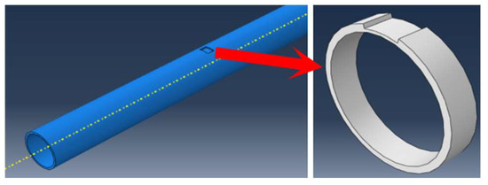 A pipeline model diagram with surface groove defects is established to study the influence of different defect angles on the monitoring. A schematic diagram of the pipeline defects is shown in Figure 11, with a pipe wall thickness of 5 mm, defect depth of 4 mm, and center angle of the defect of 240° (obtained by rotating clockwise with the 12 o’clock direction of the circumference as the starting point). The defect angle is centered at 240° and expands to both sides. It starts at 30° and increases by 30° until the maximum defect angle is 180°.