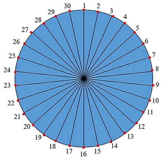 As shown in the numerical modeling diagram in Figure 2, a 1 m long pipeline model with an inner diameter of 45 mm and an outer diameter of 50 mm is built using ABAQUS. Set the material parameters at elastic modulus E = 208.3 GPa, density ρ = 7700 kg/m3, and Poisson’s ratio μ = 0.29, and made the groove defect in the middle of the outer surface of the upper part of the pipeline with the defect depth of 3 mm, length of 2 cm and the width as the arc length corresponding to 30°. Eight node hexahedral elements are selected to divide the steel pipe, and tetrahedral elements are used to refine the defects. The corresponding dispersion curve is shown in the Figure 1a. It can be found from the dispersion curve that the torsional mode T (0, 1) is a non-dispersive mode, which is the mode selected for monitoring. In actual operations, the excitation frequency of torsional mode should be controlled between the cut-off frequencies of L (0, 1) low pass and L (0, 2) high pass. However, only a simple torsional mode is excited in the monitoring without the interference of the longitudinal mode in the numerical simulation. Given the fact that the lower the guided wave excitation frequency, the longer the excitation bandwidth (which is likely to cause the superposition of modes in the monitoring), the windowed five-peak-wave Hanning signal is selected to excite the guided waves with the excitation center frequency of 50 kHz. Set the right side of the pipeline as fixed and the left side as free, and load the instantaneous circumferential displacement at the left end to simulate the excitation of torsional guided wave as shown in Figure 3. The pipeline section is divided into 30 parts, and 30 signal extraction points are set at the left quarter of the pipeline; that is, the included angle between each two points is 12°. The schematic diagram of signal extraction is shown in Figure 4.