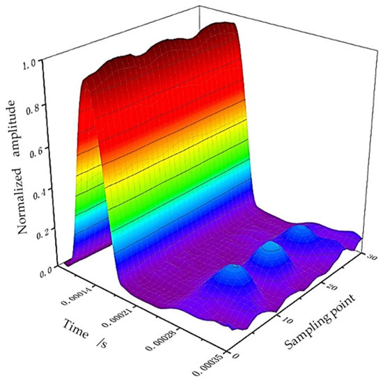The automatic integration time step size provided by ABAQUS is adopted in the numerical simulation analysis to ensure the convergence of the calculation, and the signals extracted from 30 positions are processed using Hilbert transformation. Hilbert transformation processing can map the signal in the time domain to another time domain by mathematical processing, such that the characteristic information can be highlighted, and the amplitude of the guided wave signal and its corresponding time can be found clearly and intuitively, which is conducive to defect location and damage analysis [29]. Then, a three-dimensional surface graph based on the obtained data after defining the instantaneous envelope at any time has been created, as shown in Figure 5. The peaks of the direct wave and defect echo can be clearly observed in the figure. At the same time, it can be found that the wave packets of defect echo are not simply connected together, but there are roughly three wave packets around these 30 sampling positions. In order to observe the relationship of these echoes more intuitively, the maximum value at the echo position of each defect has been extracted, drawn in the form of a radar diagram, and expressed in the form of a circular section, as shown in Figure 6.