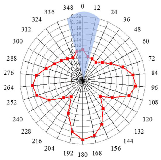 Figure 10 shows the radar diagram of defect circumferential positioning using the two monitoring methods when the defect is in the pipe wall. The blue shadow represents the actual location of the defect. It can be seen that when the longitudinal wave L (0, 2) method is used, the final radar diagram cannot be represented by a clear image and the actual position of the defect cannot be effectively located. In contrast, when the torsional wave method is used with an increase in defect depth, the ‘T’ shape of the final radar chart becomes clearer and more obvious, and the circumferential position of the defect can be well judged. Meanwhile, it can be seen from the comparison of the echo amplitude that the maximum reflectivity of the torsional wave exceeds 40%, while that of the longitudinal wave does not exceed 25%, which also shows that the torsional wave can better locate the circumferential position of defects.