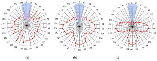 A circumferential positioning radar diagram for different defect angles is shown in Figure 12. It can be seen that when the defect angle is below 90°, the graph result shows a ‘T’ shape, with 240° of the defect center as the symmetry axis, and the defect position is above the ‘T’ shape, which is consistent with the previous conclusion. When the defect angle is greater than 90°, the amplitude of the defect echo at the defect position begins to increase gradually, and the top of the ‘T’ shape begins to bulge, while echo amplitude at the non-defect position does not change significantly with the increase in defect angles.