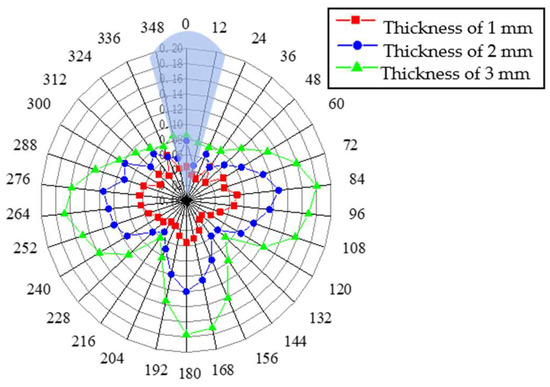 Figure 9 shows the results of the circumferential positioning radar with different defects located inside the pipe wall. It can be seen that when the defect is located inside the pipe wall, the results also follow the same law as above. Under the thickness of three different defects, the radar diagram always shows a ‘T’ shape, and the amplitude increases with increasing defect thickness.