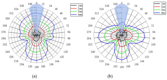 Radar map of circumferential positioning of internal and external defects of pipeline with different defect depths: (a) defect depth of 2 mm; (b) defect depth of 4 mm.