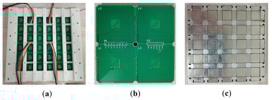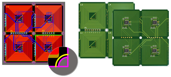 In the proposed system, the coils are arranged in a spiral pattern on a 16-layer PCB, as depicted in Figure 9b. The PCB is specifically designed to integrate 15 layers for housing the coils, with the remaining layer dedicated to wiring and other essential circuits. Each PCB incorporates four independent coils, each with its own power supply and drive mechanism. The size of a PCB that integrates four coils is 72 mm × 72 mm. The size of an individual coil is presented in Figure 3. The PCB design allows for easy extension of the working stroke by splicing together multiple PCBs at the stator’s edge. Moreover, due to the arrangement of coils on the PCB, the four coils can function independently without interfering with other existing components. This feature contributes to the reliability and flexibility of the system, providing a high degree of control and adjustability in various operational scenarios.