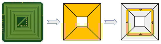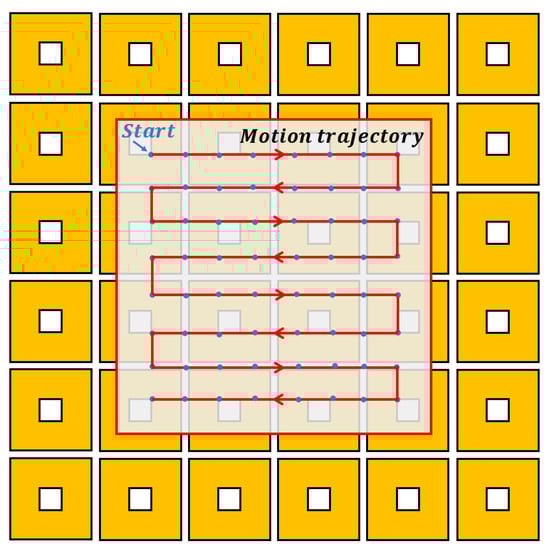 The key components of the MLPM proposed in this article are the stator and translator, responsible for generating the magnetic force. The stator comprises spliceable PCBs that integrate both hall sensors and coils. The coil design employed in this system resembles a hollow square shape, featuring a hollow side length denoted as and a single side coil width of . On the other hand, the translator adopts a 2D Halbach array structure, which ensures a unilateral magnetic field strength to enhance levitation and propulsion effects. There are two different sizes in the magnet array—the large one and the small one. Each magnet in the array has dimensions of , and . The large magnetic blocks are characterized by equal length and width, while the long side of a small magnet matches the long side of a large magnet, and the short side corresponds to its height. The magnetization direction of each magnet is depicted in Figure 3. These magnets are embedded within an aluminum plate and united as a single unit. Aluminum, known for its lightweight properties and high strength, serves as the ideal material for supporting the translator. The primary design principle throughout the entire system aims to achieve a simple structure capable of infinite expansion of the working plan.