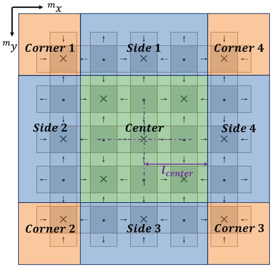In order to facilitate a more comprehensive analysis of the end effects, the 2D Halbach array employed in the system has been partitioned into three distinct regions: the center region, side region, and corner region, as illustrated in Figure 5. When the coil is positioned within the center region, the magnetic force exerted on the translator can be accurately predicted by employing traditional harmonic models, as calculated using Equation (8). On the other hand, the side and corner regions are further divided into four respective segments. Due to the rotational symmetry inherent in the magnet array, the calculation of magnetic force exhibits directional distinctions among different segments within each region.