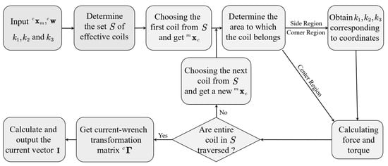 where is the pseudoinverse of the current–wrench transformation matrix . With the sensor data obtained at each sampling cycle, the current–wrench transformation matrix is solved and then used to calculate the current vector containing the exciting current for each coil.