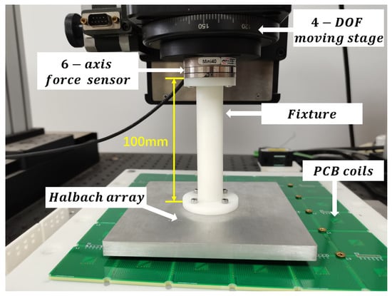 To validate the accuracy of the proposed model, an experimental setup, depicted in Figure 10, is utilized for measurement and verification purposes. The setup consists of a four-degree-of-freedom motion platform capable of movement in the x, y and z directions, as well as rotation around the z-axis within the plane. Beneath the moving stage, a six-axis force and torque sensor is fixed to measure the forces and torques exerted on the translator. The connection between the Halbach array and the sensor is established through a 3D-printed fixture, with the fixture height set at 100 mm, to ensure torque measurement 100 mm above the Halbach array. For enhanced performance compared to traditional copper-wound coils, the system incorporates PCB coils that exhibit a higher current density. By applying a direct current (DC) of 1A to a single coil using a DC power supply, the current density can reach 5.4 A/mm.