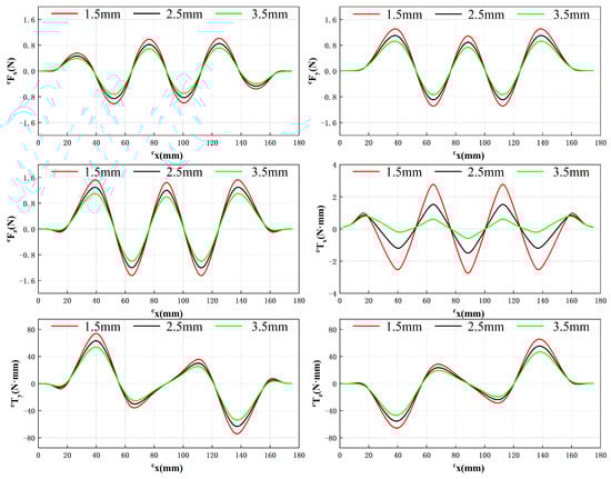 In the global coordinate system, the coordinate of the translator remains constant, while the displacement in the direction is employed as the abscissa to illustrate variations in force and torque along the -axis. The experimental measurements demonstrate that an increase in the air gap between the translator and the PCB coil leads to a reduction in the force and torque exerted on the translator. Regardless of the specific air gap value, the force and torque exhibit consistent trends with only variations in magnitude.