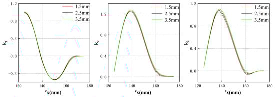 Based on the results depicted in Figure 12 and utilizing Equation (8), three coefficients, identified as , and , can be determined to correspond to different air gap values, as illustrated in Figure 13.