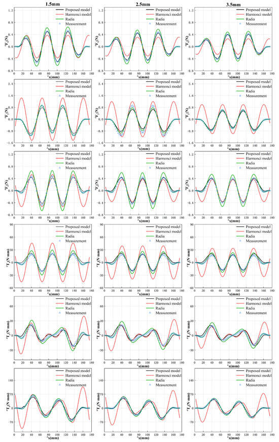 Once these coefficients are determined for a specific air gap, the force and torque acting on the translator at any point at that suspension height can be obtained. To validate the feasibility of this approach and the accuracy of the obtained k values, additional experiments are conducted. In these experiments, the three coefficients obtained are used to calculate the force and torque experienced by the translator at three different air gaps when y = 70 mm. While maintaining this specific coordinate, the translator is moved according to the motion sequence illustrated in Figure 11, with the coil passing through corner region 1, side region 1, and corner region 4 successively. Notably, the end effects occur when the coil is situated in these regions. The translator’s step distance is set to 2.5 mm, and the force and torque are measured at every 2.5 mm of movement. The proposed model, the traditional harmonic model, the result obtained by Radia and measurement results are compared, as shown in Figure 14.