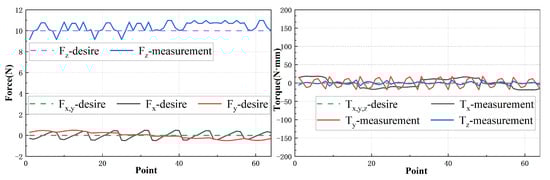 To evaluate the decoupling effect of magnetic force and torque, a wrench vector acting on the translator is assumed. Specifically, at 64 points, corresponding to a force of 10 N acting along the z-axis and no torque applied. These sampling points are located on a specific trajectory in the 81 mm × 81 mm range as depicted in Figure 15. The current vector at each point is calculated by solving the equations derived from the current–wrench transformation matrix, as described in Equation (21).