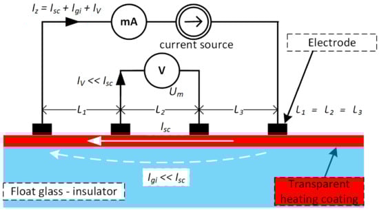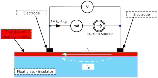 In the case of conductive layers deposited on glass (insulated substrate), the resistance measurement is related to the part where the cross current flows through a known cross-section of the layer (square). The contribution of the current flowing through the glass on which the conductive layer is deposited is negligibly small compared to the total measurement current in which the main contribution is the current flowing through the conductive layer —see Figure 3.