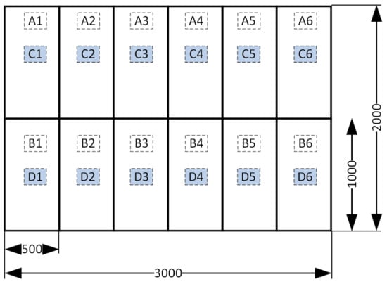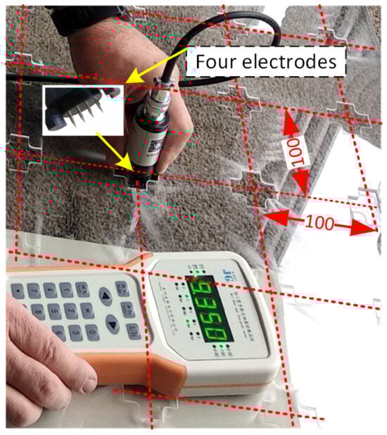 To facilitate the measurement of 48 samples with the M-3 instrument, a particular template was prepared to stabilise the measuring head of the four-point device in two directions. The slots for the measuring head were made based on a 100 mm square mesh. The template allowed the measuring head to be manually positioned in 50 positions, in two directions for each position—Figure 8. The head coordinates in the tables indicate the grid nodes in which the measurement was taken. The grid nodes are 100 mm apart in both directions. The measurement in two directions is due to the linear arrangement of the measuring electrodes.