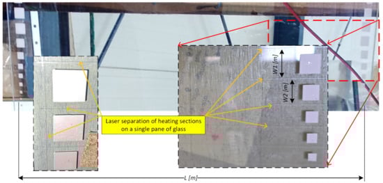 Reducing permissible thermal transmittance coefficients for new developments offers the possibility of reducing the heat transfer surface in radiators. The possibility of providing thermal comfort with a reduced heat transfer surface makes it possible to use the modern solution of heating glass []. Heating glass is obtained by applying a transparent resistive layer on one sheet of glass. Skillfully energising the resistive layer causes it to heat up and give the glass its heating property (Figure 2).