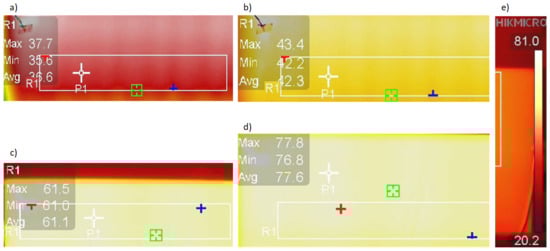 The measurement system uses an S7-1200 controller, which will ultimately be used to implement advanced control algorithms for the heating glass. Two 400 × 450 mm heating zones were separated on specimen B2 before toughening. The electrodes supplying the heating zones were made of conductive paint applied before quenching. The electrode dimensions are 400 × 10 mm. The actual resistance between the two parallel electrodes was 8.55 . The calculated resistance value for was 8.49 . The thermographic camera was 3 m away from the sample. The study started with determining the reflected temperature using a Lambert heat sink. The measurement field was delineated by a rectangle which covered a section of the heating zone measuring 300 × 100 mm. Thermographic images were taken when the radiator was heated for average temperatures in the measuring field equal to 36.6, 42.3, 61.1 and 77.6 °C. The values of the average temperatures are not ’round’ because the heating took place in a system without control. As shown in Figure 13, the differences between the minimum and maximum temperatures are minor, which allows us to assume that achieving a uniform temperature distribution on the glass surface with a uniform is possible.