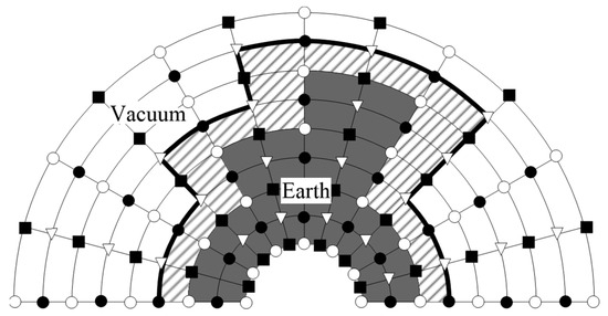 As for the setting of free boundaries, to ensure the efficiency of computation, we introduce an improved vacuum formula (IVF) [51] and apply it in the cylindrical coordinates to establish the dual free boundaries conditions in the θ-path. The IVF proves to be more versatile when dealing with ordinary free boundaries, this stands in contrast to the acoustic–elastic boundary method, which necessitates the manual configuration of the free boundaries’ condition for each specific case. The black solid line in Figure 2 indicates the position of the free boundaries in the actual calculation, the shaded area is a virtual layer whose thickness is half of the mesh, the grey area indicates the solid medium, and the white area is the vacuum layer. The formula of the improved vacuum method in cylindrical coordinates is given by: