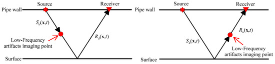 The RTM can effectively image complex structures, but it will produce low-frequency artifacts in the application of imaging conditions. For the source field in Equation (8), it can be separated into upgoing waves and down-going waves . In addition, the receiver field can be separated into upgoing waves and downgoing waves . Figure 3 indicates the reasons for the generation of low-frequency artifacts. According to the cross-correlation imaging conditions, the cross-correlation between the downgoing waves and and the upgoing waves and will produce low-frequency artifacts [53].