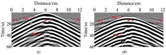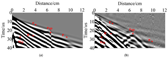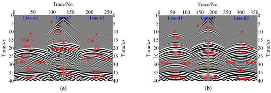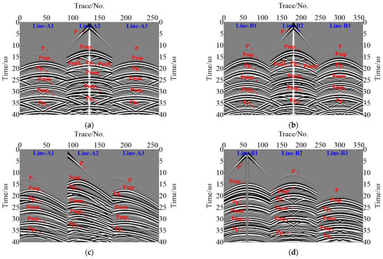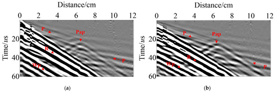 The sensor settings in Model-2 align well with those in Model-1, Figure 8a,b are the records of shot-4. As can be seen in Figure 8, the energy of the direct P wave in Line-A1, -A3, and -B3 is relatively weak, while the energy of the direct wave in Line-B1, -B2, and -A2 is relatively strong due to the relationship between the shot point’s location and the sensor design. The effective signals of Pap from the inclusion defects are weak in Line-θ1 and -θ3, but stronger in Line-θ2, which can clearly be identified. Furthermore, Ppap from the pipeline’s inner wall via the slag inclusion as well as PmD1 and PmD2 generated from the inclusion defects endpoints are clearly found in all the records, which has helped to image lower boundaries of slag inclusion.