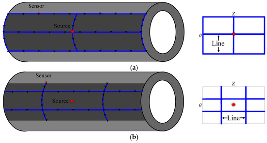 In the actual UT of pressure pipelines, due to the limitations of the site factors, the sensors and survey lines cannot be arranged arbitrarily. In order to detect the pipeline with the least number of survey lines, it is necessary to discuss in detail the observation system with the best sensor settings. To improve the imaging quality and investigate the influence of the sensor settings on the imaging results, we used different sensor arrangements which are located on the outside of the pipelines. As shown in Figure 10, there are four different sensor settings for different observation systems.