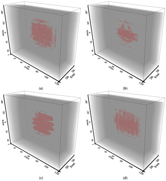Figure 11 shows the RTM imaging results for different sensor settings. Figure 11a–d, respectively, correspond to the RTM imaging results for the four different sensor settings shown in Figure 10a–d. It can be clearly seen in Figure 11a that the delamination defect interface can be well presented in the first group of imaging results. Although the boundary is not very obvious, the position of the event corresponds to the position of the delamination defect. The imaging range accuracy up to 73.16%. In the imaging of the second group (Figure 11b), only part of the delamination defect can be imaged, and the defect structure cannot be accurately obtained, which does not meet the imaging requirements. The imaging range accuracy is only 49.35%. Figure 11c shows that the effective coverage of the interface area decreases in the third group, which is not conducive to the interpretation of the defect boundary structure, and only the defect structure in the middle region of the model can be analyzed and explained. The imaging range accuracy is 56.63%. As shown in Figure 11d, the fourth group has better imaging results in the region of defects and the obtained events are continuous, which reflects the information of the delamination defects well. The imaging range accuracy up to 79.76%. Therefore, it is shown that the single-shot observation system under the sensor settings of six survey lines (three horizontal and three vertical lines) or five horizontal survey lines can obtain better imaging results when performing RTM imaging of the delamination defects. This observation method is effective and feasible.