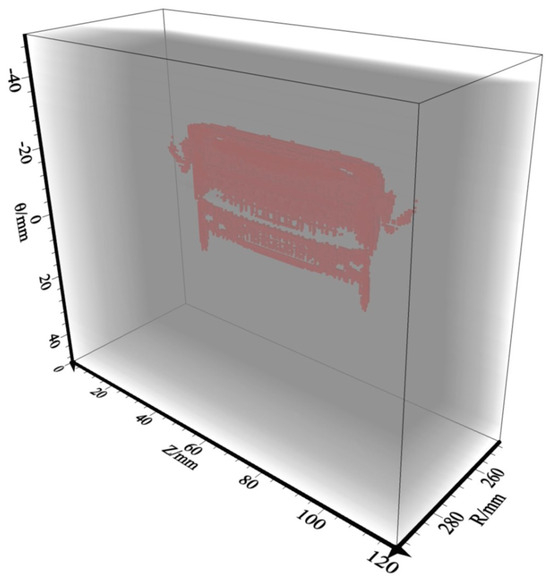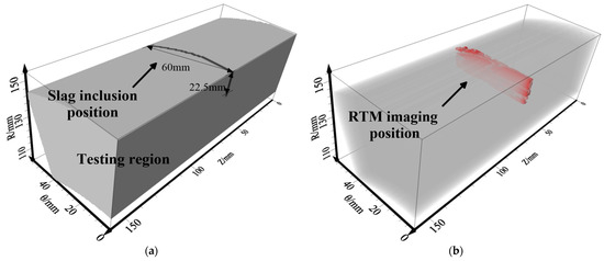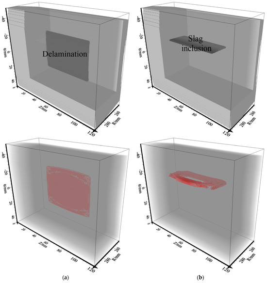 In order to obtain higher-precision imaging results and inspect the whole pipeline with the least cost (sensors), this paper adopts the method of multi-shot points (shot-1~shot-5) for stacking to obtain the final imaging result. The 3D ultrasonic RTM images were generated from a five-shot stack and denoised by source illumination compensation and Laplace filtering. Results for the delamination defect are shown in Figure 13a, it can clearly be seen that, when five shots are stacked, the imaging effect is evidently better than single-shot imaging, and the upper and lower interfaces of the delamination defects are clearly visible. There is a good match between the entire imaging result and Model-1 in terms of position and shape, and the defect information can be fully reflected in the interface region. The imaging range accuracy was up to 98.65%. It can be seen from Figure 13b that, for slag inclusions, the surrounding boundaries can be well imaged, especially the bottom boundary. While the absence of reflection points results in missing information in the central region, the whole imaging result matches well with Model-2 in terms of location, and the slag inclusion information can be fully reflected from the boundaries’ region. The imaging range accuracy is 63.44%.