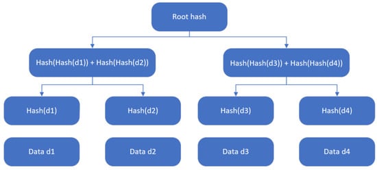 - A hash-based signature algorithm was proposed by Ralph Merkel and is considered to be one of the feasible alternatives to traditional digital signatures (RSA, DSA, ECDSA, etc.) [37]. Due to the lack of effective quantum algorithms to quickly find collisions in hash functions, hash-based constructions (with sufficient output length) can resist quantum computer attacks. The Merkle tree is shown in Figure 2.