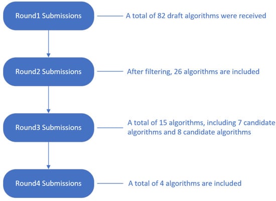 On 21 December 2017, NIST released 69 complete and suitable drafts from the first round after an initial screening, and the candidate algorithms were discussed, as shown in Table 5.
