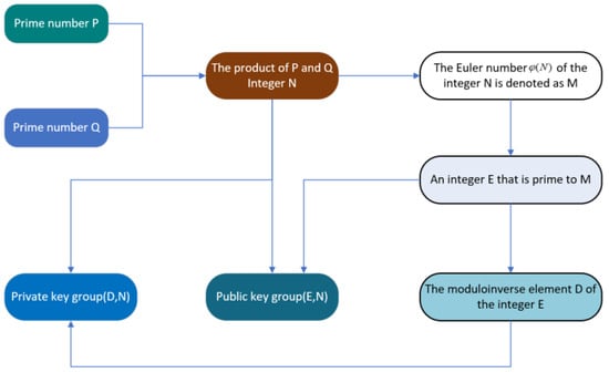 RSA is very representative of traditional asymmetric encryption algorithms; the next section will be a brief introduction to RSA. The foundation of the RSA algorithm relies on a straightforward principle from number theory: multiplying two large prime numbers is a straightforward task, yet factoring their resulting product proves to be exceedingly challenging. This property enables the product to be utilized as the encryption key, specifically the public key. The two arrays of large prime numbers are amalgamated to form the private key, facilitating encryption [45]. The RSA algorithm key generation process is shown in Figure 4. The RSA algorithm is described as follows: