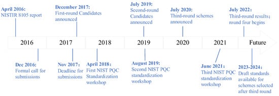 In February 2016, NIST gave a talk at PQCrypto 2016, calling for anti-quantum encryption algorithms for new public-key cryptography standards and began a global call for PQC standards. In April of the same year, NIST presented at [48] and described the influence of quantum computing on traditional public-key encryption and symmetric encryption, provided an introduction to four different types of post-quantum encryption algorithms, and described quantum computer hardware developments, and concluded by pointing out directions for future research [49].