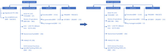 Ultimately, as of 30 November 2017, NIST received 82 draft algorithms. During the AsiaCrypt 2017 conference on 4 December 2017, NIST delivered a presentation titled “The Ship Has Said: The NIST Post Quantum Crypto ‘Competition’”. The presentation emphasized that with the advent of large-scale quantum computers, the necessity to transition from public-key cryptographic algorithms to post-quantum cryptographic algorithms would be crucial. Conversely, the urgency for addressing symmetric algorithms is less immediate, as adjustments to parameters can potentially provide solutions, as shown in Figure 6.