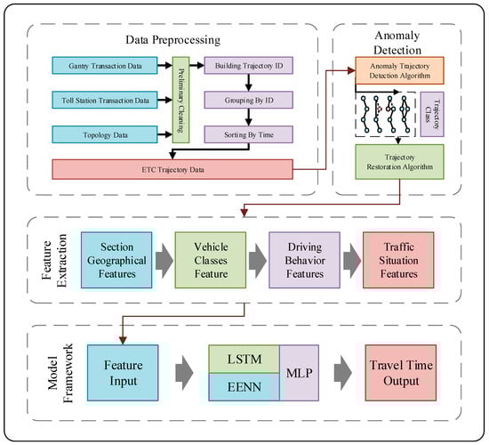 To address the issue of ETC missing transaction data time restoration, we propose a deep learning model based on multi-attribute feature analysis. First, we preprocess the ETC data. Subsequently, we classify the trajectory data using an anomaly trajectory detection algorithm. Then, we extract the relevant features. Finally, we use these features as the inputs for the model. The overall architecture of this method is shown in Figure 1.