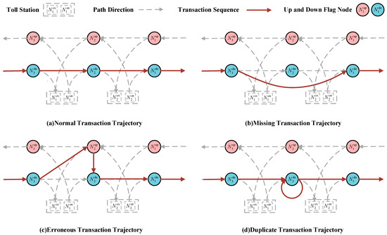 Abnormal transaction events mainly include three types: missing transactions, erroneous transactions, and duplicate transactions [1]. Figure 2 displays the gantry transaction order of different kinds of abnormal trajectory data. The essence of erroneous and duplicate transactions is data redundancy, which can be directly deleted. The key issue to be addressed in this paper is the missing transaction data. According to statistics, the probability of having more than two consecutive gantries experiencing missing transactions is less than 5% [1]. Therefore, this paper mainly targets the majority of cases for restoration, hereby stipulating that in the missing transaction trajectory data discussed in the subsequent parts of the article, only one gantry is missing consecutively. This mean that there are normal transaction records for the two gantries adjacent to the missing gantry. According to the definition, in the missing transaction trajectory data, there exists a missing transaction road , where the is the missing transaction gantry. From the definition of travel time, based on the transaction time of the vehicle at and the travel time of the section , the transaction time at can be calculated as follows:
