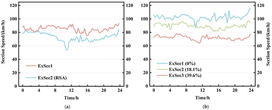 (a) Section speed variation curve for common sections and service area sections, where represents common section and represents service area section. (b) Section speed variation curve for three different sections; the tunnel lengths account for 0%, 18.1%, and 39.6% of the total section length, respectively.