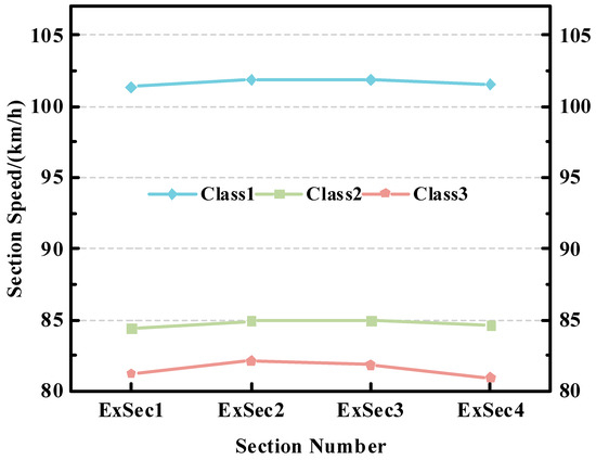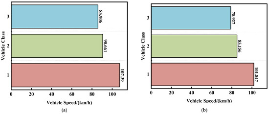 As shown in Figure 4, after the merging of vehicle classes, the three classes of vehicles show significant differences in their travel speeds over long and short distances of sections. Therefore, we construct vehicle classes feature vector , with the value ranges being 1 (class 1 passenger vehicle), 2 (class 1 freight vehicle), and 3 (other classes of vehicles).